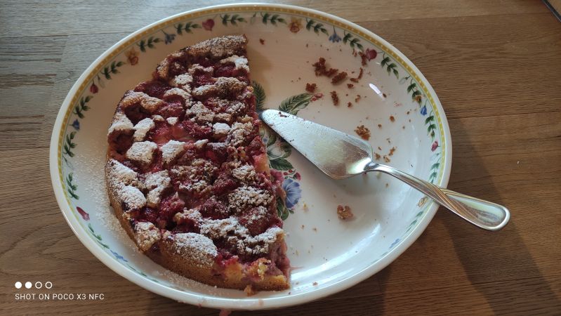 Na sliki spodaj je današnja pita. Kot lahko vidite sem od sadja izbrala jagode.