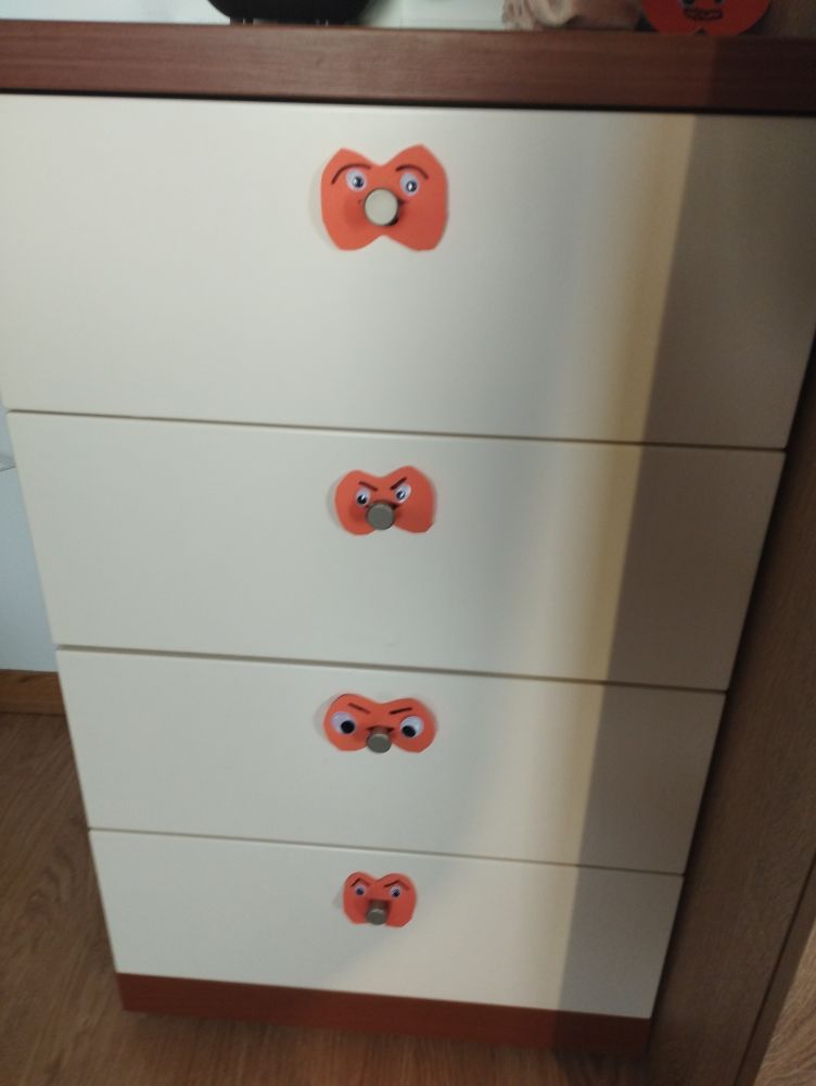 Iz tiste mehke pene( ig da se rece Guar gumi pena-ne me uzet za besedo) ali filca izrezi obliko buce velike do približno 5-10 cm. Nariši oči in obrvi na mestu ust pa izreži luknjo ki naj bo velika toliko kot držalo na predalu.