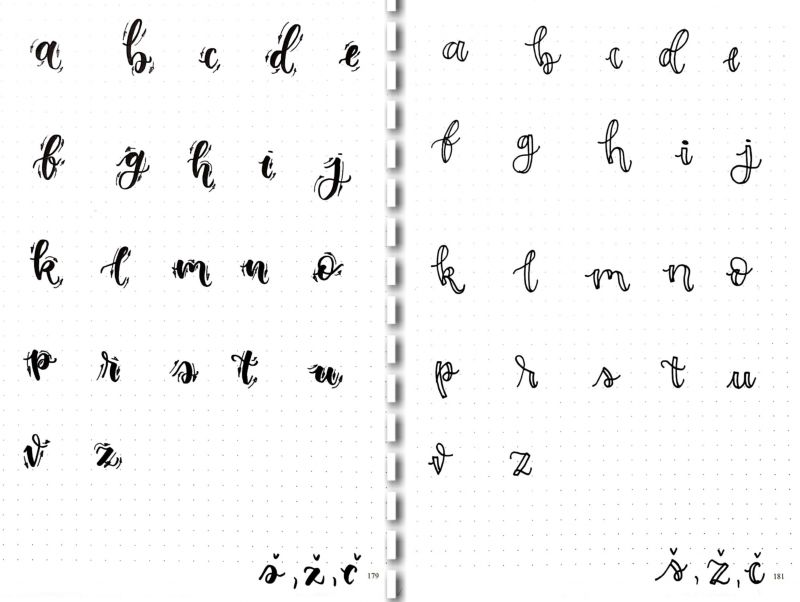 Če nimaš na voljo brushpena lahko poiskusiš tudi za navadnim črnim flomastrom ali finelinerjom, tako da samo pišeš s pisanimi črkami, potem pa greš tam kjer si šel z flomastrom na vzdol povdariš ali pa narediš dve črti (težko razložim, zato bom tudi pripela sliko - desna abeceda)