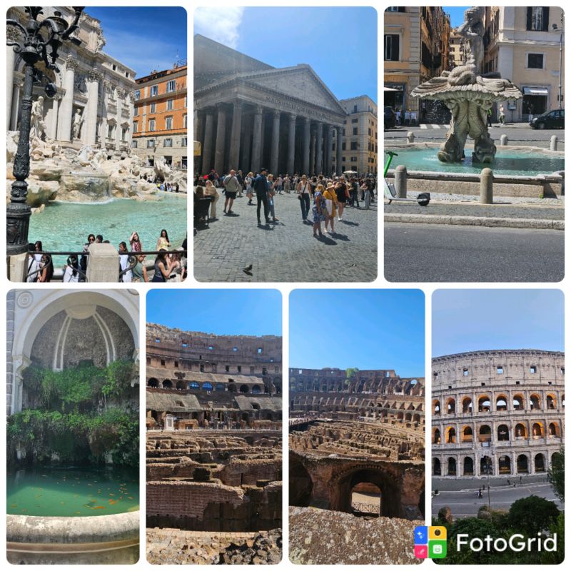 smo že 3 dan v rimu. danes smi si ogledali kolosej od vznotraj,palatin in pa forume .tzdi fintani di'trevi in pa panteon. tu j3 kolažek:relaxed::blush::wink::kissing_smiling_eyes::kissing_closed_eyes::kissing_heart: