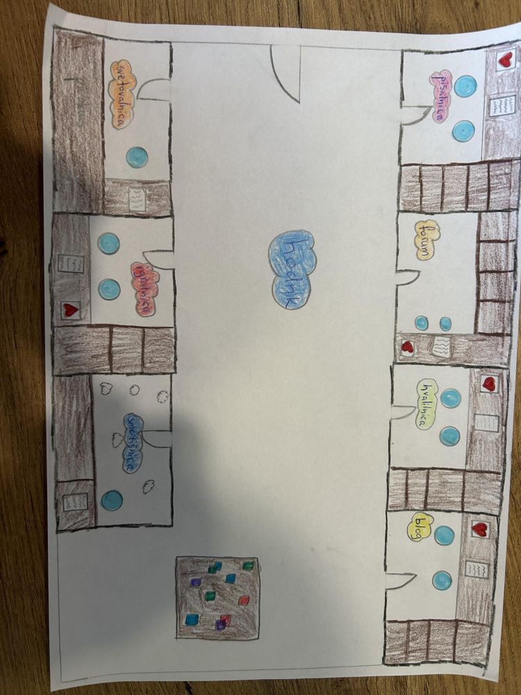 *modra*Hodnik*modra* ja to je velik prostor kot vidite in tista miza tam je miza sporoÄilc in tega. Tko kot so sporoÄila na hodniku tle, so v moji domiÅ”ljiji listki na mizi.