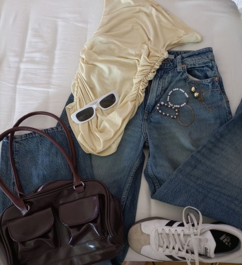 Torej hlače so to najboljše kar sem mela. Majčka je rumena ampak ni tank top čeprav je kr podobna. Očala sem mela bela al pa črna in so bela lepše pasala. Uhančki so zlati, verižica se slabo vidi ampak je neka basic zlata in zapestnice so moj combo, ko ga vedno nosim če pač nosim zlat nakit. Torbica ni čist rjave barve, ampak je s temuja tak da ja. Čevlji so toti edini adidas, ko jih mam. Za pas pa prosim ne bit jezni, ampak jaz pasa nimam nobenega in sem ta del izpustila. Upam da vam je všeč.