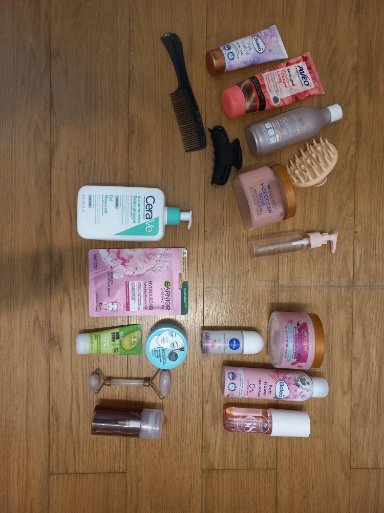 ~*b*Skincare:*b* Vsak moj everything shower si gor dam tole hidrativno masko, tale je znamke Garnier, ubistvu usebuje korejsko rožo Sakura. Pol si dam gor še tele eye patche, k so s hialuronsko kislino in alore vero, za zmanjšanje podolčnjakov<33 Potem pa si čez kako urco naredim še 'taprav skincare', in sicer CeraVe cleanser za oljasto kožo, hrastovo lubje ter pa serum (ni ga na slikici, ker sem ga pozabla slikat). Tole je pa še un roller, za de-puff evekt hehe<3 Zvečer pa si dam gor še overnight masko z avokadom, ter pimple patche, če je potrebno<3