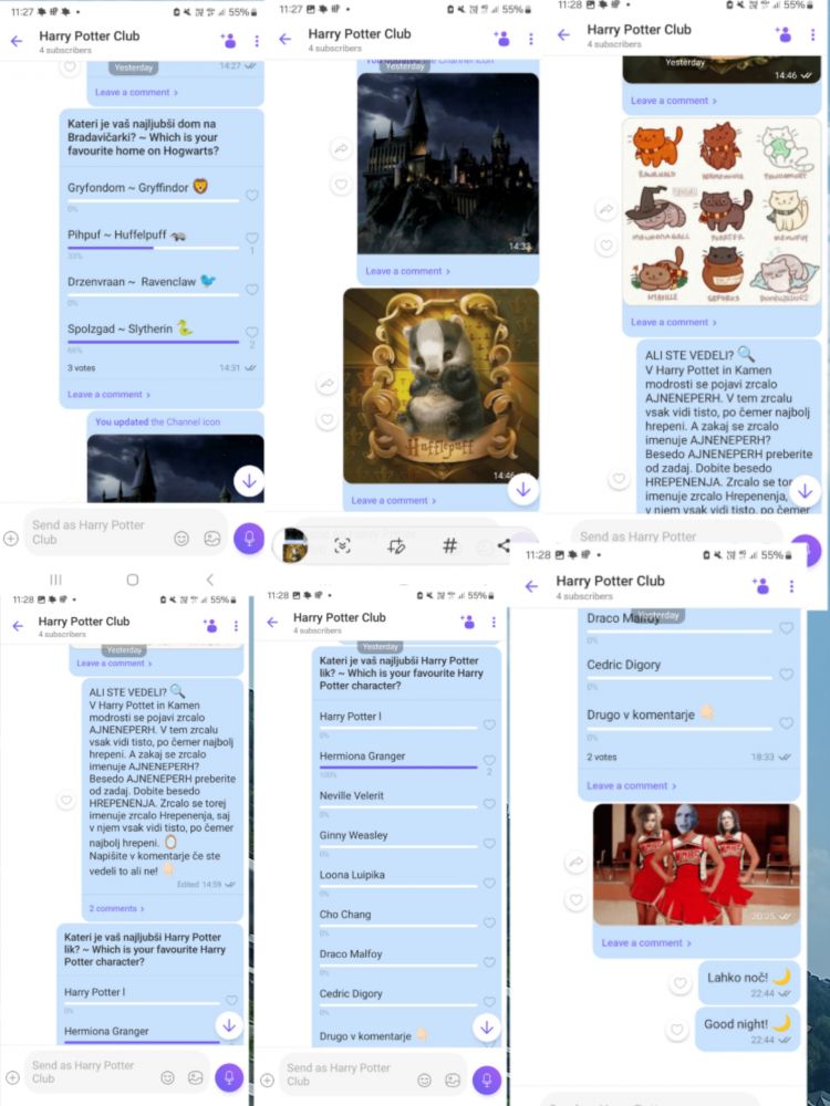 Jaz sem na Vibru naredila channel Harry Potter Club. Če kdo hoče ga lahko joina! :wink: Primerno je za vse Harry Potter fane. rilagam vam par posnetkov, da vidite kako je!