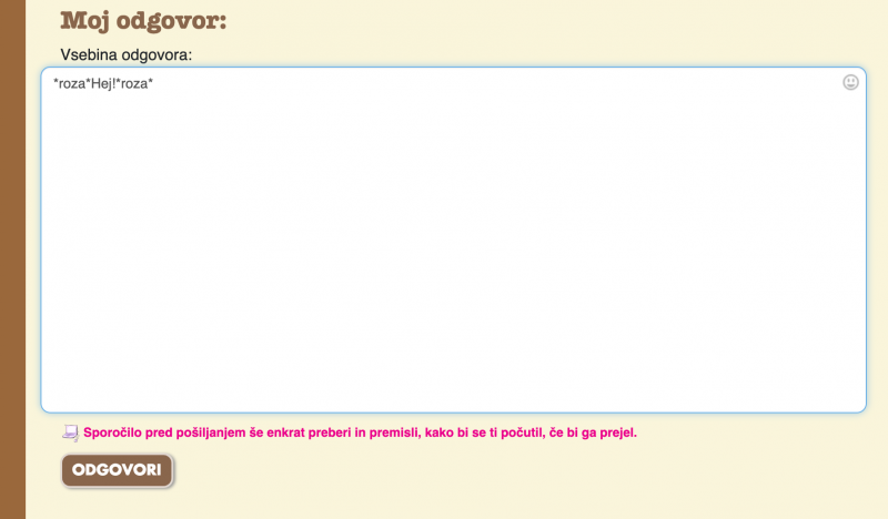 Hello že vnaprej upam da mi odgovorite. Jaz sem že tretjič nekaj napisala na to spletno stran. Torej enkrat sem pisala uredništvu enkrat teti Justi enkrat pa ordinaciji. Problem je v tem, da ko sem kliknila napis brskaj po člankih in sem kliknila rubriko v katero sem pisala nikjer ne najdem svojega sporočila. Na nobeni rubriki ga ni pa sem prepričana da sem ga poslala. Res nimam več idej kam naj pogledam. Ali mi lahko prosim pomagate ali p vsaj odgovorite ker me res zanima. Hvala vnapreeeej!:wave::wave::wave: