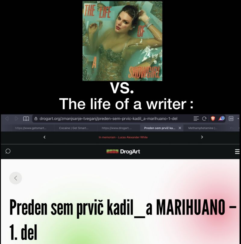 Novi meme, upam da vam je vseč. (Vsa okenca so informacije o drogah) Nad albumom od Taylor bi moralo sicer pisati The life of a showgirl, ampak je bila prostorska stiska.